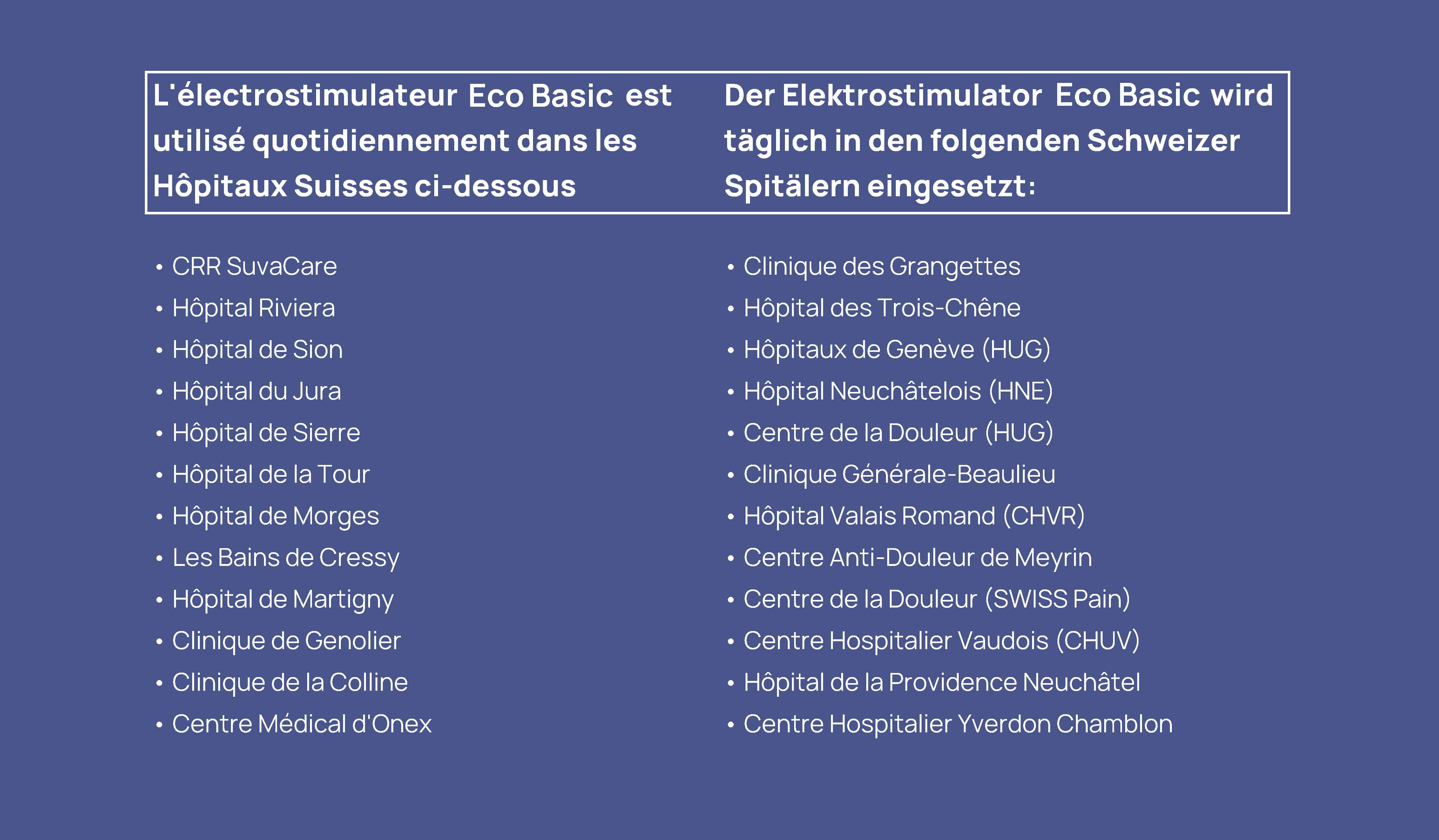 - 1 électrostimulateur Eco Basic (à visée antalgique avec les programmes pour la stimulation vagale) fonctionnement avec piles alcalines (fournies)